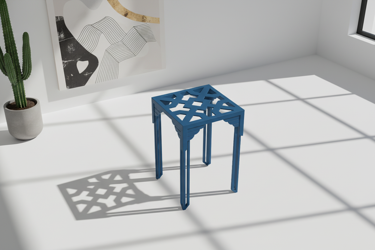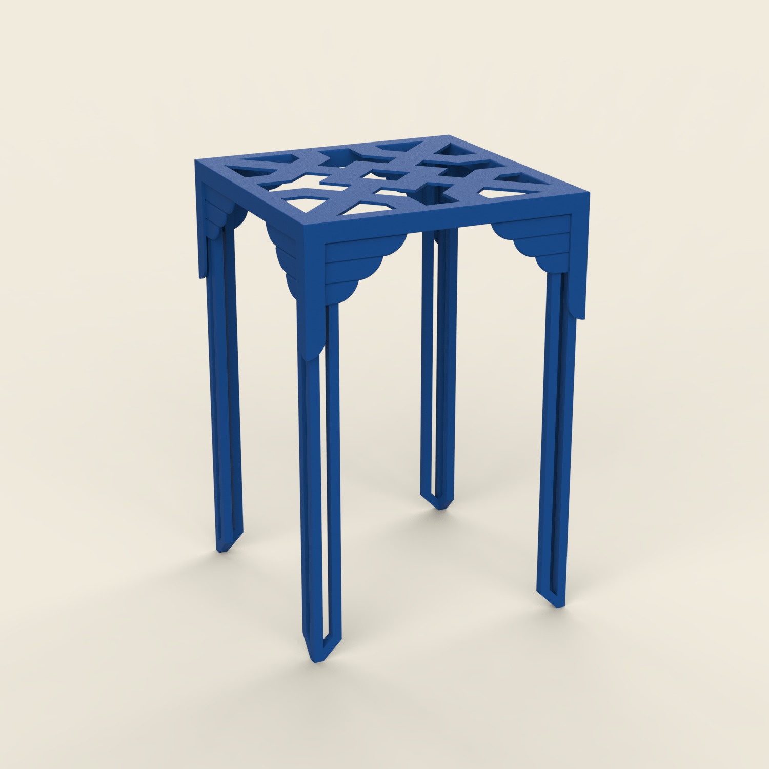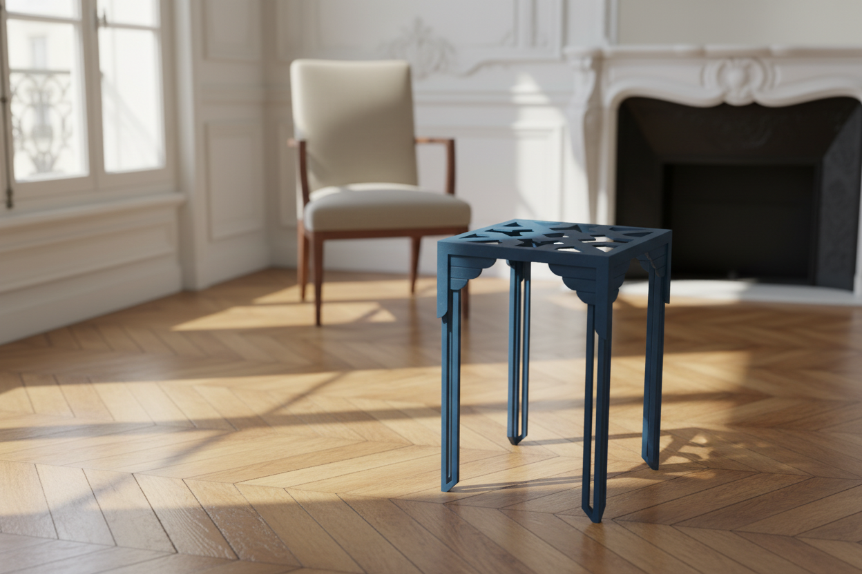 Leurs pieds, reprenant les trois lignes distinctes, prennent la liberté d’exister dans l’espace en contournant les angles. Un ornement inspiré par l’iconographie Art Déco les surmonte pour les relier visuellement entre eux. Cette dynamique orbite tout autour du tabouret pour créer une continuité parfaite quel que soit l’angle dont on l’observe.