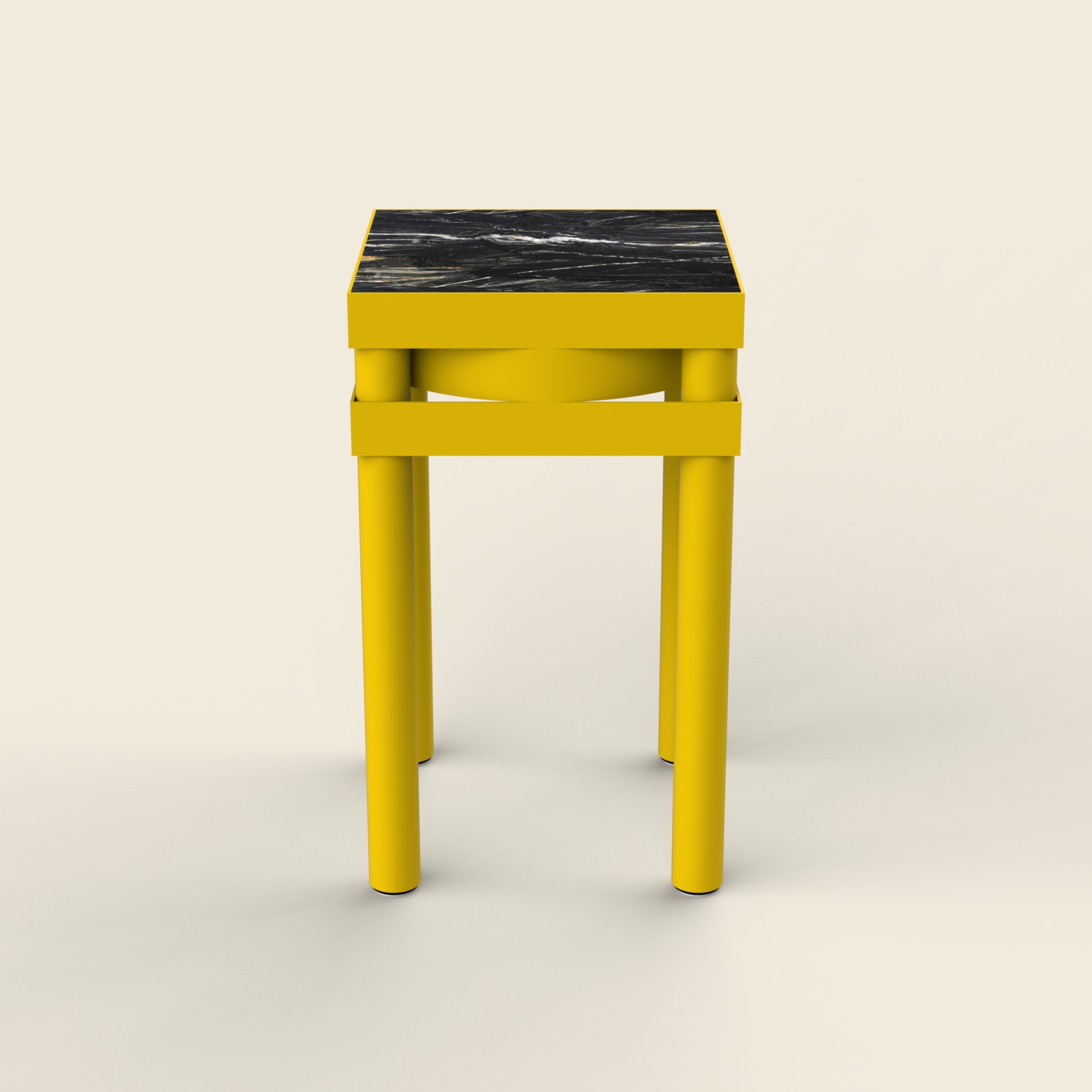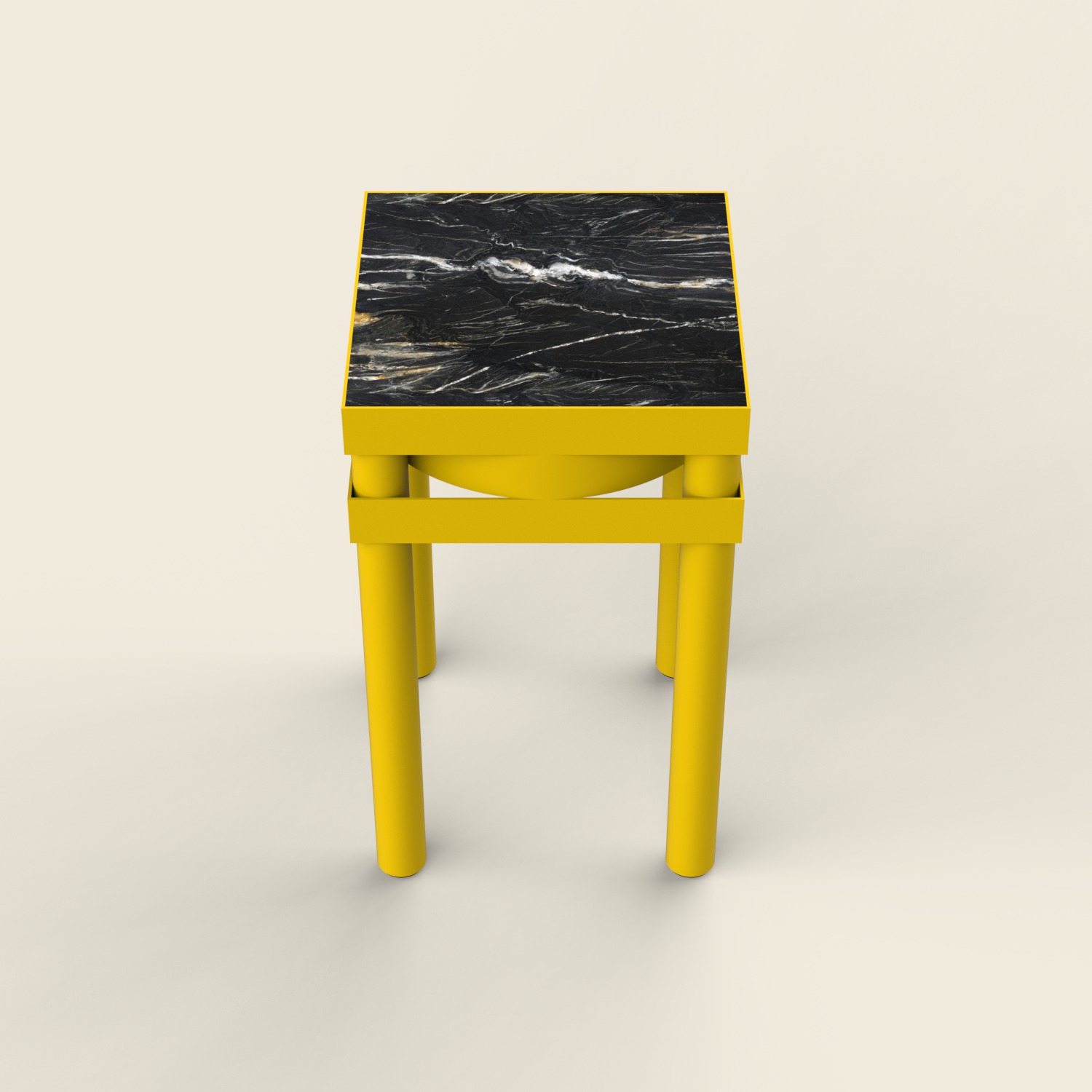 Elle entremêle harmonieusement des formes rondes et carrées sur plusieurs plans visuels, dont l’apogée réside dans son élégant plateau constitué de pierre naturelle à la couleur complémentaire de son corps.